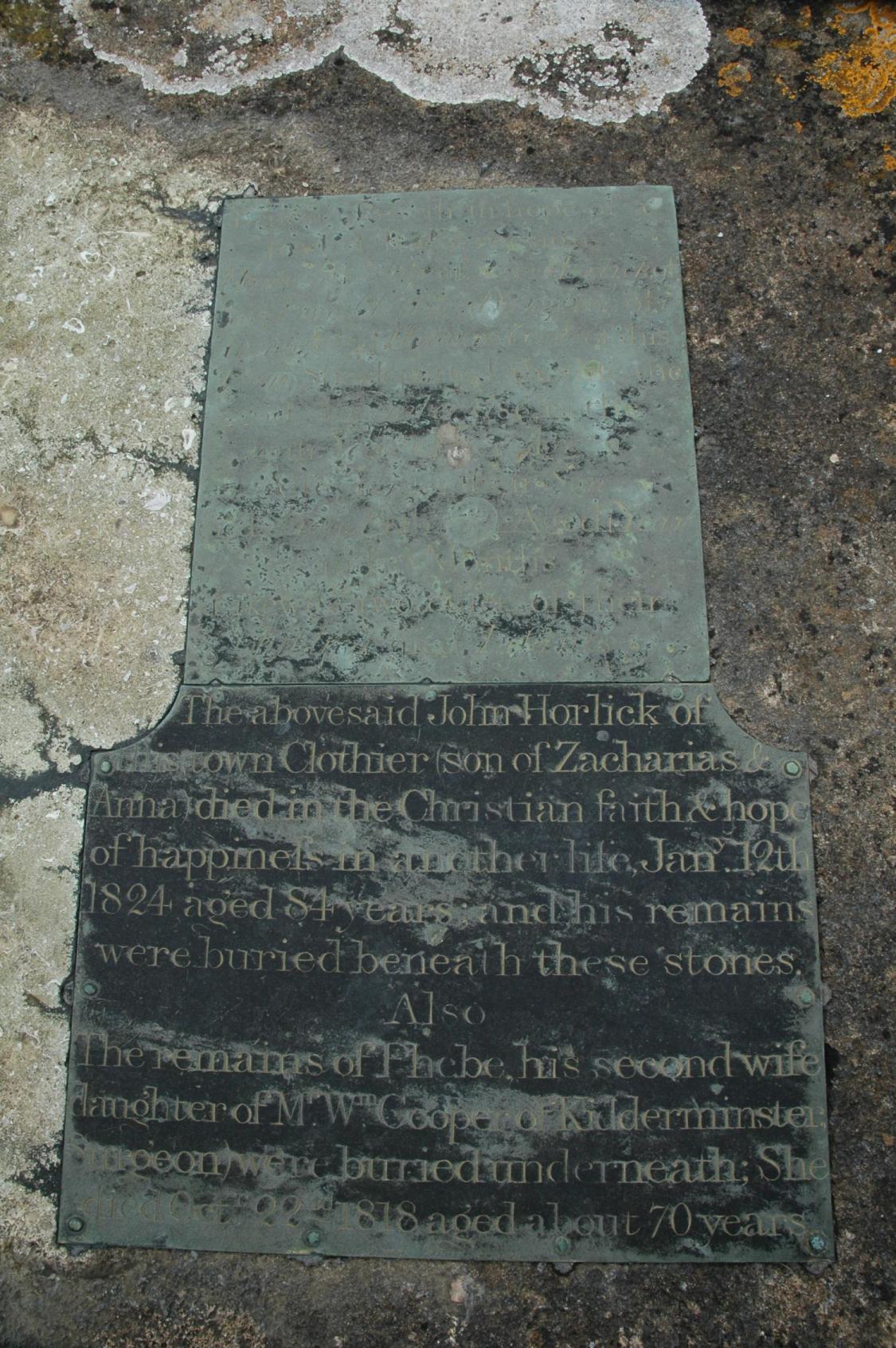 http://www.wishful-thinking.org.uk/genuki/GLS/Painswick/MIs.html "Hannah, w/o John HORLICK, Of this town, Clothier, & d/o Thomas & Hannah GYDE, 22 Nov 1786, 49 James, s, 6 Aug 1774, 1yr & 10 months. Also two children died in infancy John, s/o Zacharias HORLICK, And Hannah his wife, 12 Jan 1824, 84 Also remains of Phoebe his 2nd wife, d/o of Mr William COOPER, Of Kidderminster, Surgeon, is buried underneath, 22 Oct 1818, 70"