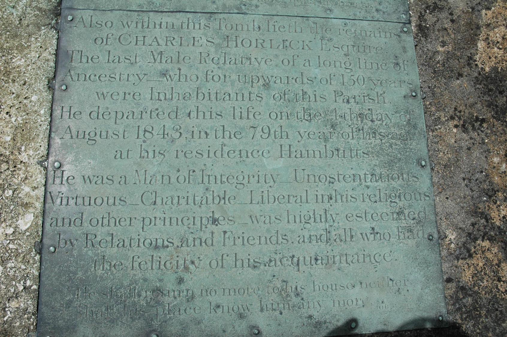 From http://www.wishful-thinking.org.uk/genuki/GLS/Painswick/MIs.html (Inscriptions in Painswick Churchyard); Elizabeth, 30 years beloved w/o Charles HORLICK of this parish, A Gent, & d/o John BROOM, Of Kidderminster, Esq, 2 Sept 1826, 57 Charles HORLICK, Esq, late male relative of a long line of Ancestry who for upwards 150 years were inhabitants of this parish, he departed this life, 4 Aug 1843, 79 years, at his residence Ham Butts, he was a man of integrity unostentatious virtuous charitable liberal in his religious and other principals was highly esteemed in relations and friends and all who had the felicity of his acquaintance