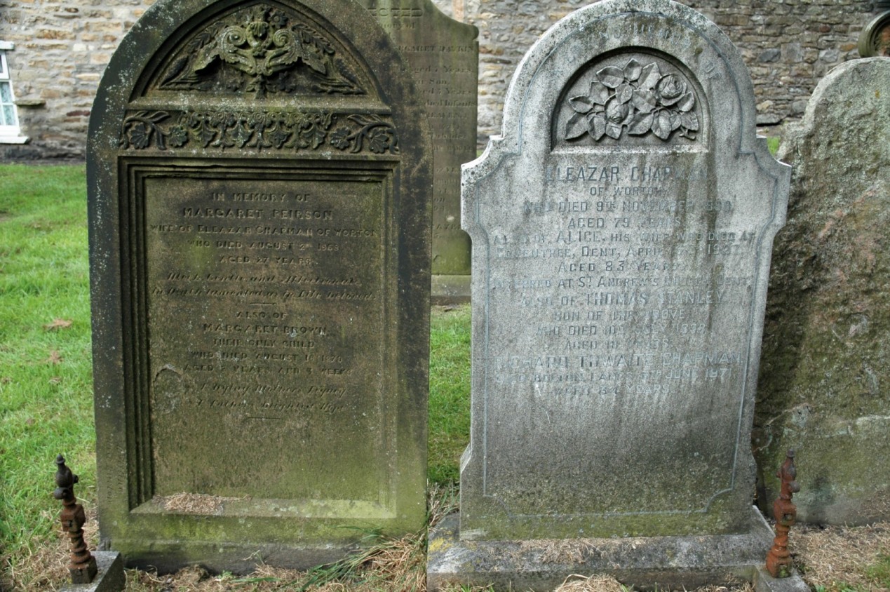 Initial info from Eleazar Chapman's grave in Askrigg. Alice married Eleazar Chapman, son of Thomas# Chapman and Isabella# Moor, Q4 1876 in Aysgarth, Yorkshire. (Eleazar Chapman was born in 1820, christened on 12 Mar 1820 in Askrigg, N Yorks, died on 9 Nov 1899 and was buried in Askrigg, N Yorks.) |