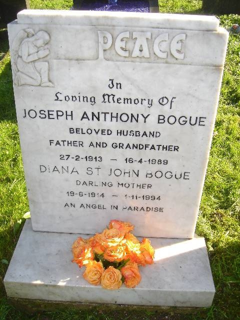 Info originally from AG-P research, but more from Wendy Henderson. Diana married Joseph Anthony 'Paddy' Bogue, son of John Bogue and Unknown, on 14 Nov 1942 in St Peter's Church, Woolwich New Road, Woolwich. (Joseph Anthony 'Paddy' Bogue was born on 27 Feb 1913, died on 16 Apr 1989 and was buried in Charlton Cemetery, Cemetery Lane, London SE7.) |